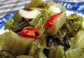 Món thịt kho tàu thường ăn với dưa cải chua, đó là những cây cái xanh lớn được bà tôi chọn làm dưa. Món dưa chua ngày Tết giúp ăn với thịt kho tàu bớt ngán, giúp dễ tiêu hóa hơn. Những cây cải xanh được bỏ vào lu nước muối, để vài ngày cho lên men tự nhiên, cải sẽ có màu vàng, ăn rất giòn và chua. Giờ đây khi tôi lớn, mỗi khi gần Tết tôi thường nói bà làm món dưa cải, vì tôi rất thích ăn món này với thịt kho. Ngày nay, khi mà mọi thứ đều có thể mua dễ dàng ỏ chợ nhưng nội tôi vẫn tự tay làm món dưa này vì bà nói dưa cải người ta làm ngoài chợ làm không kĩ và có bỏ thêm hóa chất gì đó…và mấy cô chú, gia đình tôi vẫn thích món do nội làm hơn.